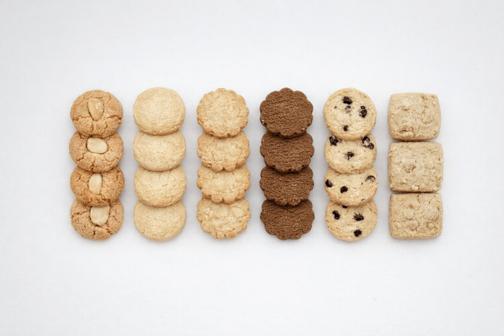 Dins de cada caixa hi trobareu un assortiment de diferents sabors com xip de xocolata, coco, cacao, canyella o ametlla. Aquesta varietat permet gaudir d’una experiència diversa i descobrir matisos diferents en cada galeta.